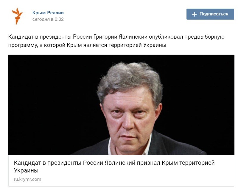 17.01.2017 кандидат в президенты от партии Яблоко Григорий Явлинский официально опубликовал свою предвыборную программу. К пущей радости наших соседей из Украины одним из столпов, на которых она держится – передача Крыма украинской стороне.
