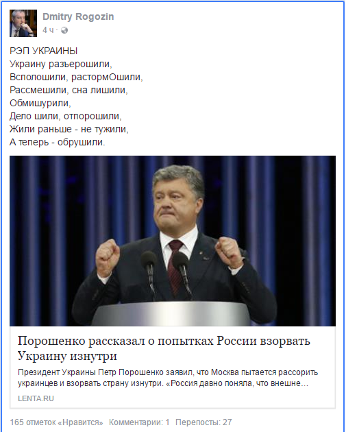 В своем аккаунте Facebook он опубликовал произведение под названием "Рэп Украины". В нем Рогозин рассказал, как страну сначала "разъерошили ", затем "растормОшили", в какой-то момент — "отпорошили" и, в конце концов, "обрушили".