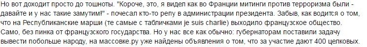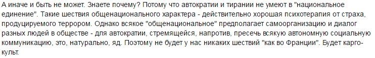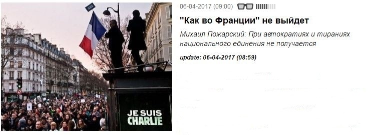 В статье под названием «Как во Франции» не выйдет», Пожарский, как это и присуще либерально настроенным «экспертам», вновьтсравнивает Россию и Запад. Вот и сейчас, после появившейся информации о готовящихся в стране антитеррористических митингах, им была найдена возможность провести аналогии в привычном для себя ключе.
