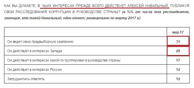 Свои «антикоррупционные расследования», основанные на фейках, Навальный объясняет борьбой за светлое будущее гражданского общества. Хотя для многих очевидно, что они являются элементом его предвыборной кампании. Такого же мнения придерживаются и большинство респондентов. А треть опрошенных уверена: Навальный действует в интересах Запада.