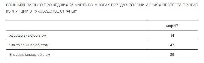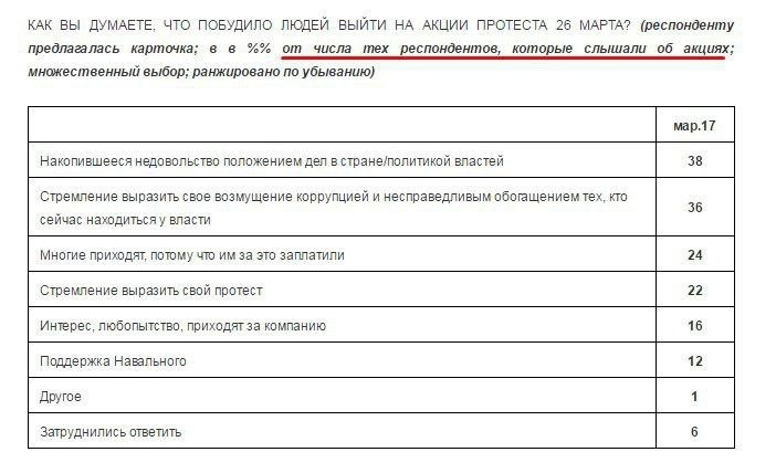 После детального изучения исследования «Левада-центра» куда-то испаряются 40% поддержавших «акции протеста», о чем раструбили сегодня либеральные СМИ, и предстает совершенно противоположная картина. Данная цифра является результатом множественного выбора, предложенного участникам опроса из числа тех респондентов, которые что-то слышали о мероприятиях 26 марта, а таких всего 14%. Указанные издания не упоминают в своих материалах и об этом.