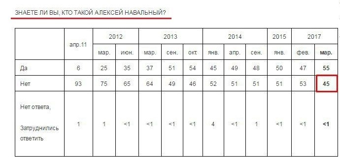 Вот еще интересные данные, согласно которым 45 % опрошенных респондентов вообще никогда не слышали о Навальном. С таким уровнем поддержки о президентских амбициях Алексею лучше и не вспоминать; он не тот политик, который нужен России. Это наглядно продемонстрировали результаты опроса «Левада-центра».