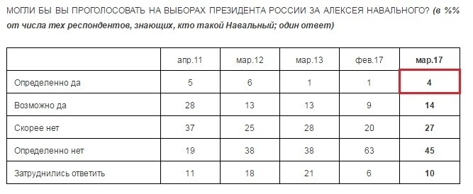 Заявивший о своих президентских амбициях Алексей Навальный должен обратить внимание на следующие цифры: стандартные для блогера-оппозиционнера-«политика» 4% поддержки являются потолком его рейтинга. На большее он вряд ли может рассчитывать. В расчете хоть как-то исправить данное положение, Навальный пиариться как может, организовывая несанкционированные акции протеста.