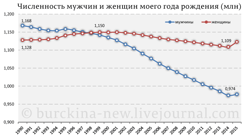 По этим цифрам видно, что 191 тыс. парней и 5 тыс. девушек моего года рождения не пережили этих 25 лет. Всплеск 2015 года связан с присоединением Крыма, кстати. Тут также видно, что картинка искаженна - она искаженна значительным миграционным приростом. Особенно видно это по росту численности женщин в 90-е.