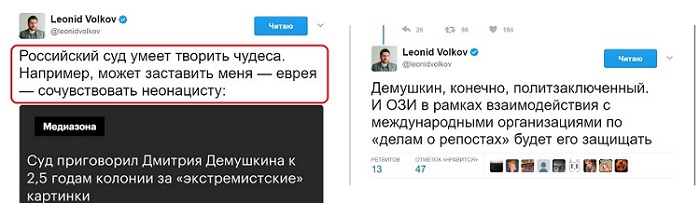 Кстати, особо активно поддержал «узника совести» Демушкина глава штаба и правая рука того же Навального Леонид Волков.