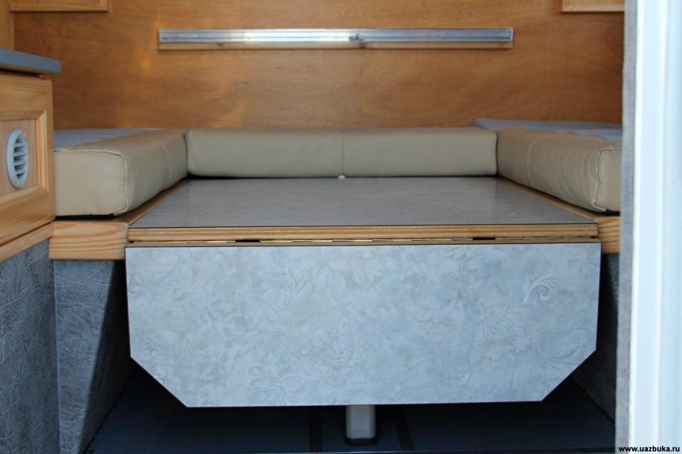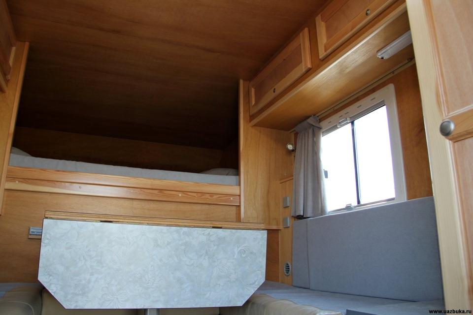 Так, в жилой модуль встроены розетки со стандартными разъемами, имеются места для подключения водоснабжения, а в нависающем над крышей алькове размещается двуспальная кровать размером 1790х1930мм, дополнительное спальное место есть в обеденной зоне (1100x1900мм). В задней части транспортабельного блока находится ниша для газового баллона.
