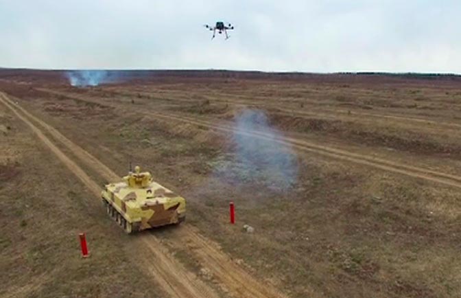 Ориентировка в пространстве выполняетя по камерам, расположенным на борту, а также с помощью квадрокоптеров. Дальность управления – до пяти километров. По сути, во время боя оператор может находиться далеко от передовой, управляя своей машиной. При этом вдали от непосредственного места боестолкновения у него нет присущего подобной обстановке мандража, страха. Человек действует более осознанно, спокойно, принимает нужные решения взвешенно и с учетом всех факторов обстановки.