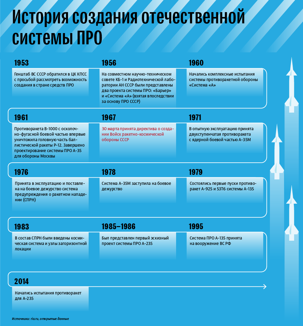 Сейчас за оборону столицы отвечает система противоракетной обороны А-135. Ее разработка началась в 1971 году, а первые пуски прошли в 1979 году. А-135 состоит из радиолокационной станции "Дон-2Н" в подмосковном Софрино, командно-вычислительного пункта 5К80 в Пушкино и нескольких стрельбовых комплексов, оснащенных противоракетами ближнего перехвата 53Т6.