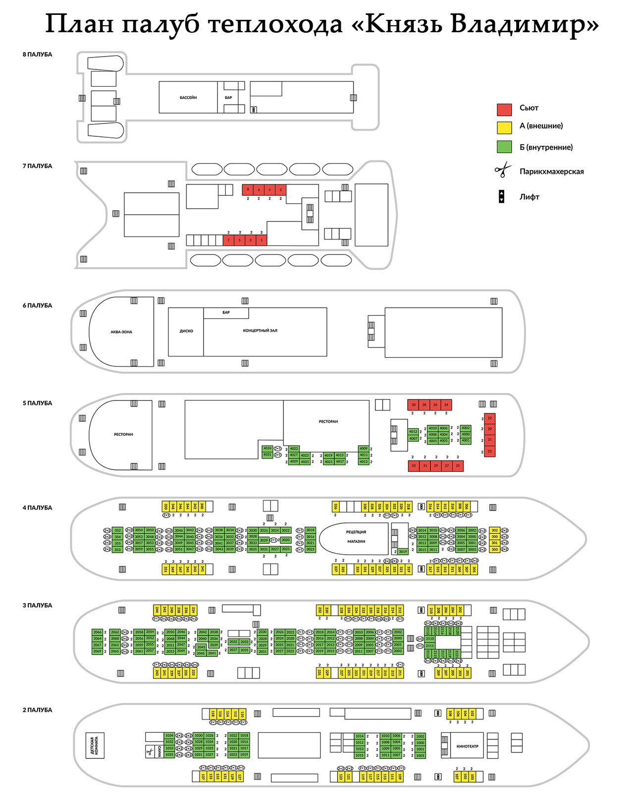 «Князь Владимир» представляет собой 9-палубный отель. Всего на судне 300 кают, оно вмещает 800 пассажиров и 250 членов экипажа.