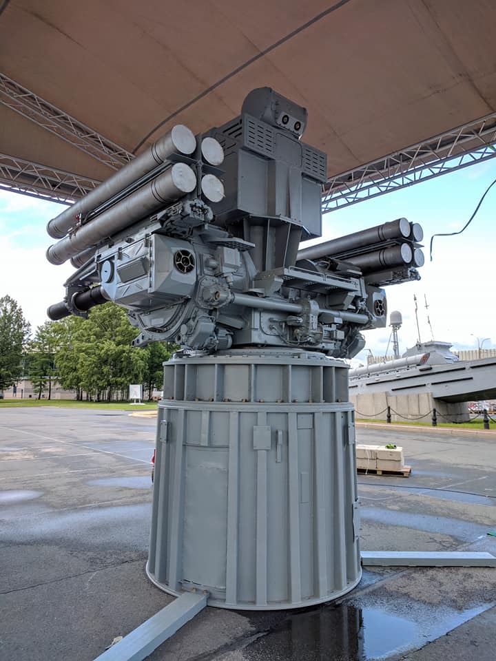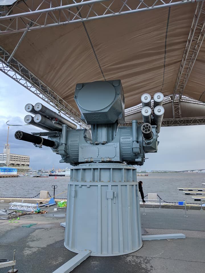 Опытный образец корабельного зенитного ракетно-пушечного комплекса "Панцирь-М" разработки АО "Конструкторское бюро приборостроения имени академика А. Г. Шипунова" (Тула) при подготовке экспозиции восьмого Международного военно-морского салона МВМС-2017. Санкт-Петербург, 26.06.2017 (с) Михаил Жердев Источник