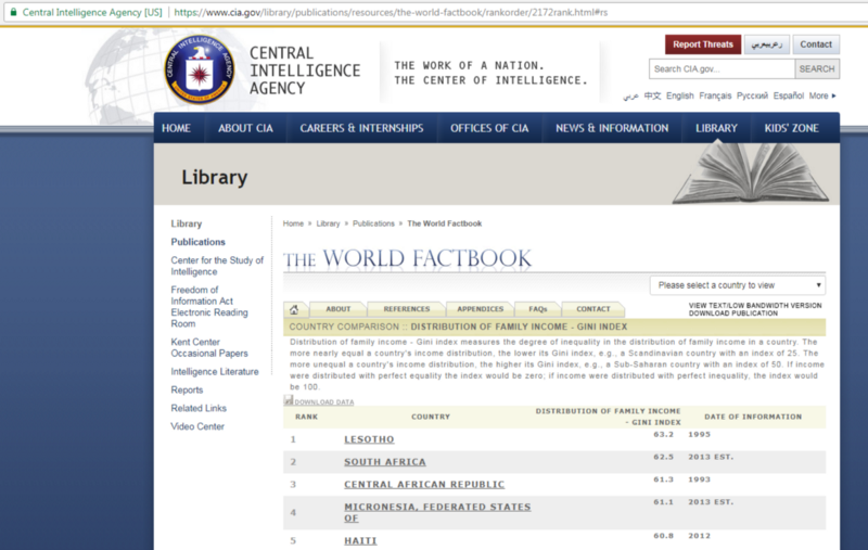 По коэффициенту Джини (GINI), исходя из данных справочника ЦРУ, Россия находится на 53 позиции. На первом месте Лесото и Южная Африка. США располагается на 43 строчке.