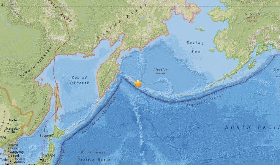 Землетрясение магнитудой 7,4 произошло сегодня в Беринговом море примерно в 700 километрах к востоку от Петропавловска-Камчатского.
