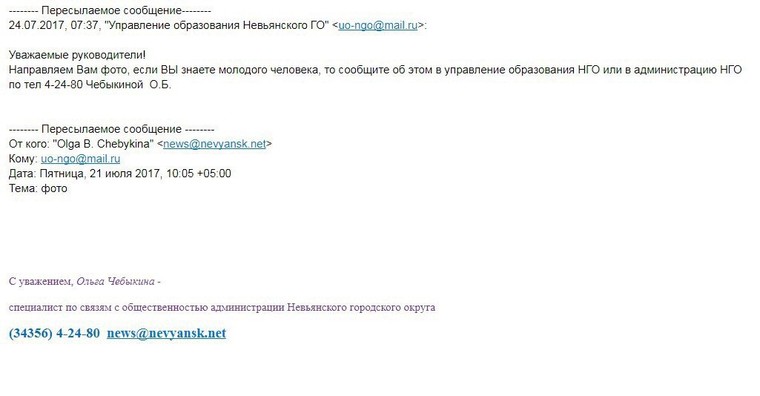 «Это был предварительный разговор, подробнее мы поговорим позже. Но уже понятно, что подросток снял видео, а власти на ролик прореагировали своеобразно: они объявили парня в розыск. В рассылке, которую сделала по указанию начальства сотрудница администрации Ольга Чебыкина, было сказано: „Уважаемые руководители! Направляем вам фото, если Вы знаете молодого человека, то сообщите об этом в управление образования НГО или администрацию НГО по тел. … Чебыкиной О. Б.“ Лицо школьника [на видео было] предусмотрительно закрыто размытой „маской“ при видеомонтаже. Но иногда, во время резких движений, эта маска „не успевает“ за картинкой и лицо видно. Чиновники сделали скриншот, и это фото разослали. Позор — школьника, проявившего активную жизненную позицию, разыскивали как преступника!» — рассказал «URA.RU» адвокат Николай Харченко.