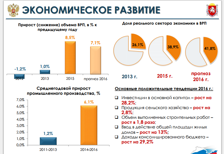 Реальный сектор экономики Крыма вырос с 26,1 до 41,8%. Инвестиции в основном капитале возросли на 28,2%. Продукция сельского хозяйства – на 2,8%. Объем выполненных строительных работ – в 1,8 раза. Ввод в действие общей площади жилых домов – на 13%. Доходы консолидированного бюджета – на 29,2%.