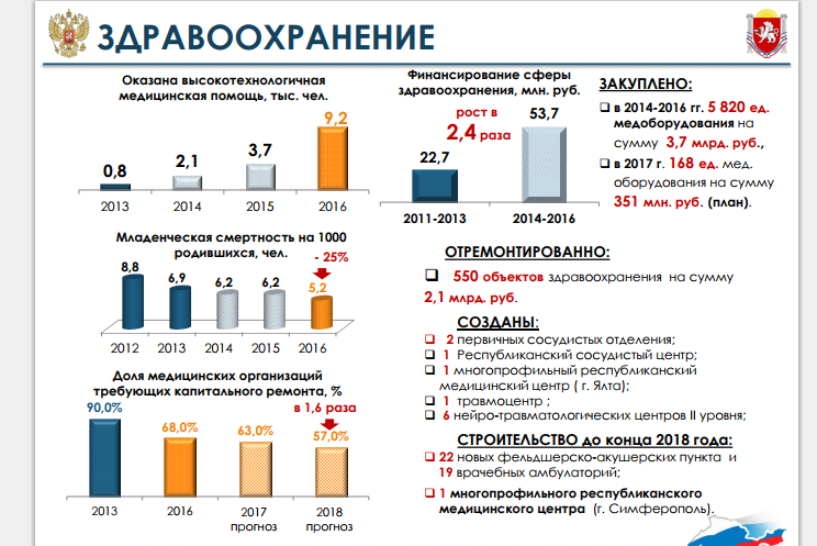 Касаемо здравоохранения. Здесь также отмечаются положительные показатели. К примеру, на 25% снизилась младенческая смертность. Снизилась доля медорганизаций, что требовали капитального ремонта, в 1,6 раза. Финансирование сферы здравоохранения выросло в 2,4 раза по сравнению с данными, полученными за период 2011-2013 годов. Закупается огромное количество медицинского оборудования, вовсю ремонтируются объекты здравоохранения. В планах построить 22 новых фельдшерско-акушерских пункта и 19 врачебных амбулаторий, а также многопрофильный республиканский медцентр в Симферополе до конца 2018 года.