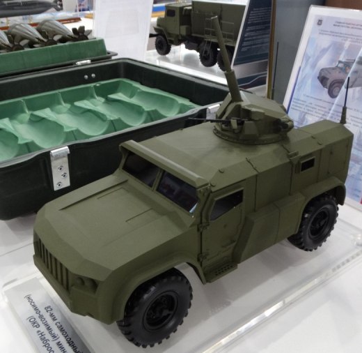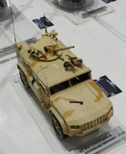 Модель варианта 82-мм самоходного миномета 2С41 "Дрок", создаваемого по ОКР "Набросок" при головной роли АО «Центральный научно-исследовательский институт «Буревестник» (Нижний Новгород; входит в состав АО «Научно-производственная корпорация «Уралвагонзавод»), на стенде на стенде Главного ракетно-артиллерийского управления Министерства обороны Российской Федерации в экспозиции Международного военно-технического форума "Армия-2017" (с) "Вестник Мордовии" / vestnik-rm.ru
