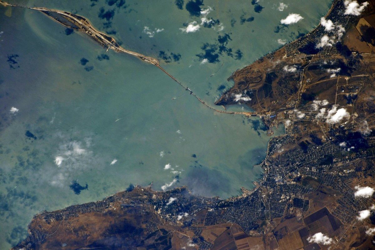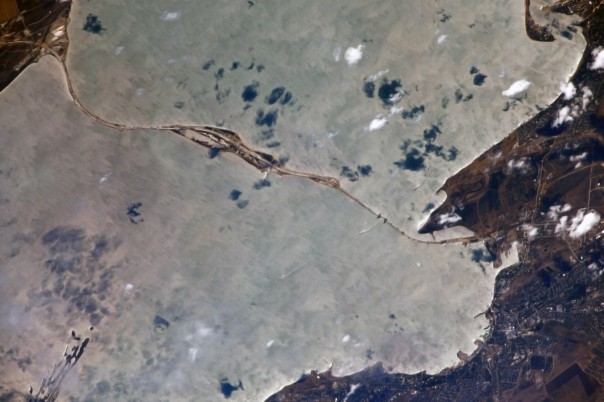 Керченский мост и недавно установленная железнодорожная арка. Вид из космоса.