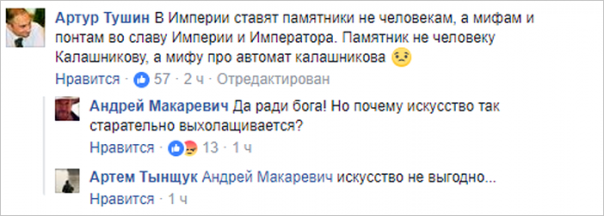 «Мне очень жаль, что в последнее время из оформления нашей столицы искусство уходит начисто. Как специально кто-то делает. Эти чудовищные арки картонные, которые заслоняют архитектуру, это удивительное отсутствие вкуса, и памятник Калашникову сюда вписывается по полной программе. Если человека не научили в детстве отличать красивое от некрасивого, если он не имеет соответствующего образования или он просто был двоечником, то объяснить словами это невозможно», — приводит слова Макаревича РЕН ТВ.