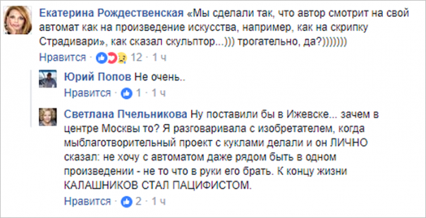 Кроме того, музыканту не понятно, зачем делать монумент конструктору, если автомат никогда не стоял на защите нашей страны.