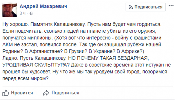 Лидер группы «Машина времени» Андрей Макаревич раскритиковал открывшийся в центре столицы памятник легендарному оружейнику Михаилу Калашникову. По мнению музыканта, автомат Калашникова не должен быть предметом национальной гордости.