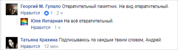 Особенное негодование вызвало у музыканта «бездарное» исполнение скульптуры. По словам певца, «мы уродуем свой город, позоримся перед всем миром».