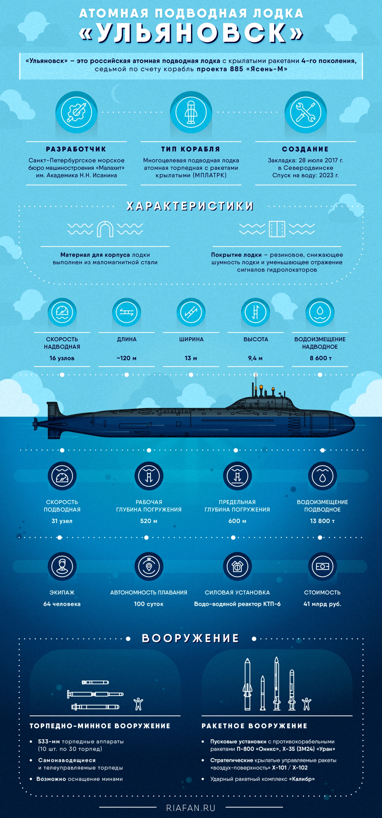 Стоит обратить внимание, что «Ульяновск», несмотря на то, что внешне практически ничем не отличается от собратьев, будет обладать совершенно новыми характеристиками — улучшенными ходовыми качествами, уровнем скрытности, радиотехническим обеспечением. По сути, это будет совершенная новая атомная подводная лодка, которая впитала в себя все лучшее от предыдущих проектов.