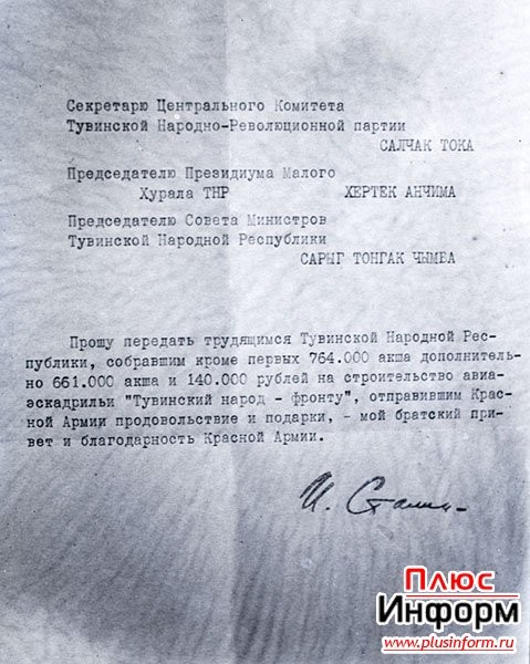 Благодарность для тувинского руководства от И.Сталина