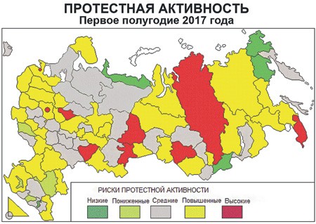 Протестная активность в регионах заметно выросла в первой половине 2017 года. По используемой в мониторинге КГИ шкале это 907 баллов по сравнению с 733 в первом полугодии 2016-го. Авторы доклада КГИ подчеркивают, что прирост достигнут прежде всего за счет акций против коррупции и действий правоохранительных органов (с 40 до 188 баллов) и по проблемам жилья и коммунальных услуг (с 40 до 88 баллов).