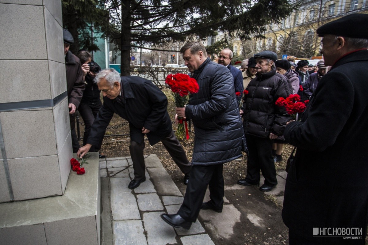 Участники праздника положили гвоздики под бюст Ленина. На фото на первом плане — мэр Анатолий Локоть с цветами в руках