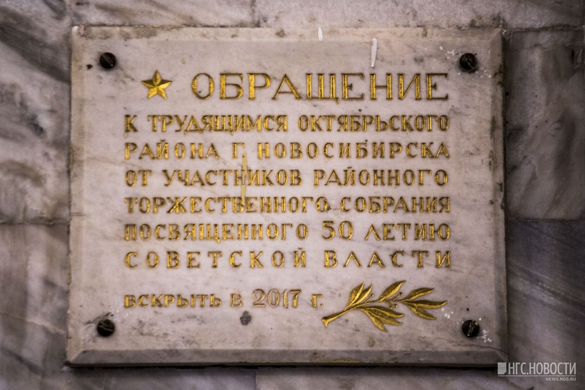 Обращение к потомкам пролежало в стене вестибюля ДК 50 лет, замурованное специальной табличкой, — его подписали 4 ноября 1967 года на торжественном пленуме райкома КПСС и сессии исполкома Совета депутатов трудящихся Октябрьского района Новосибирска. Жители района попросили вскрыть капсулу через 50 лет, в год столетия Октябрьской революции.