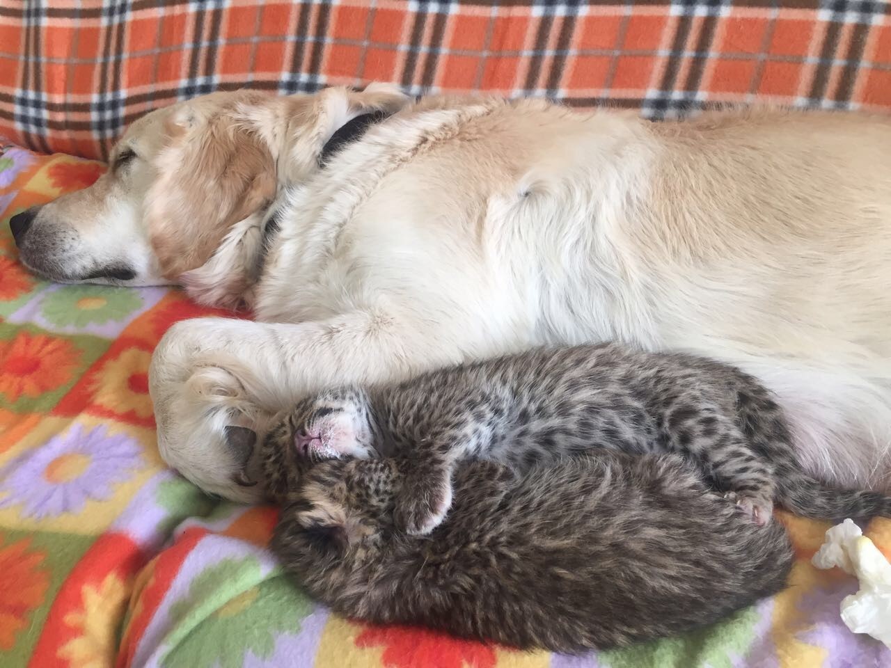 Сотрудники зоопарка пытались кормить малышей, но те очень слабо сосали молоко из бутылочки, поэтому срочно пришлось искать «маму» из мира живой природы. Замысел увенчался успехом: живущая в парке собака — золотистый ретривер по кличке Тесси — недавно родила четырех щенков, и она охотно приняла в свое семейство еще двух детенышей.