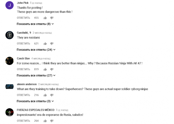 "Для чего они так тренируются? Супергерои? Эти ребята действительно супер солдаты- киборги- ниндзя."- пишет некто, считающий силу русских излишней и не отвечающей современным реалиям.