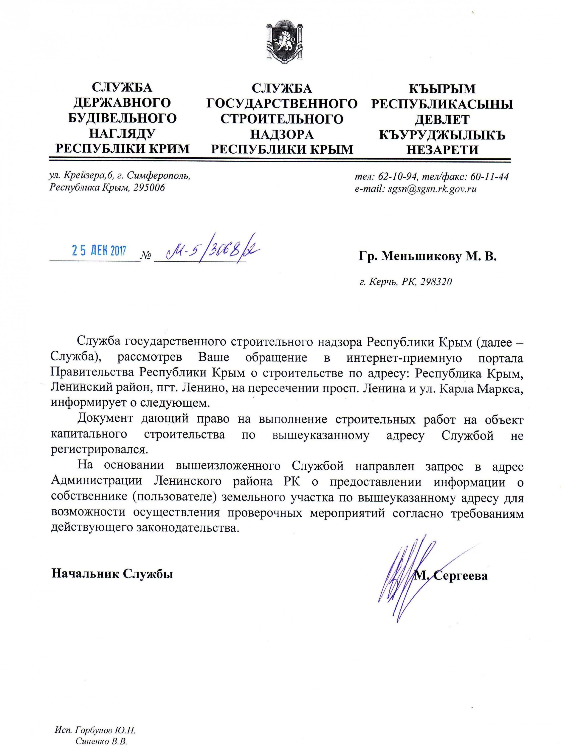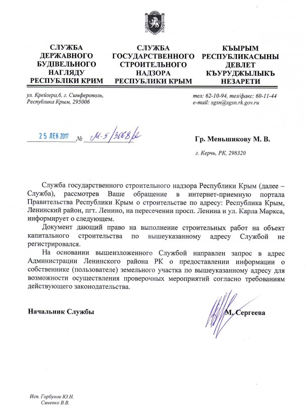 В ответе на запрос начальник службы госстройнадзора Марина Сергеева сообщает о том, что строительство объекта капитального строительства произведено без разрешительной документации, в связи с чем в адрес администрации Ленинского района РК направлен запрос о предоставлении информации о пользователе земельного участка для принятия мер согласно требованиям действующего законодательства.