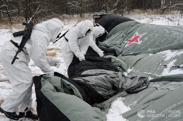 Военнослужащие 45-го отдельного инженерно-маскировочного полка развертывают средство маскировки войск в Московской области