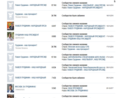 Бесполезная затея, ведь у Грудинина настолько сомнительная репутация, что клеймо ставить негде. Ну, а привлечение ботов вообще за гранью. На одной видимости далеко не уедешь. Кроме того, лишь человек, далекий от интернета, мог не заметить, как в декабре 2017 года в соцсети «ВКонтакте» появилось более тридцати одноименных групп в поддержку миллиардера. Только названия городов менялись, а в остальном различий не было.