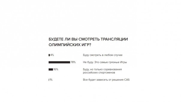 Мы провели опрос на нашем сайте, и на момент написания статьи 78% наших читателей сказали, что смотреть соревнования не будут. За что им низкий поклон, приятно знать, что ты не один. А телевизионщиков, транслирующих Олимпиаду, предлагаю проучить низкими рейтингами. Просто не смотрите их, эти люди показали свое отношение к России и нам с вами таким решением.