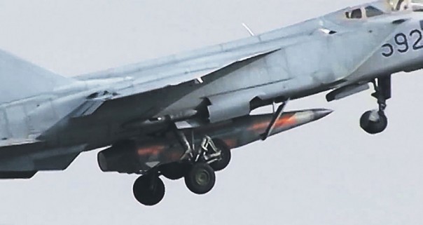 На кадрах, иллюстрирующих слова президента, видно, что носителем является МиГ-31, а сама ракета крепится под фюзеляжем. Попробуем оценить размеры изделия. На глаз длина ракеты – семь метров, диаметр корпуса – примерно 0,8 метра. В хвостовой части видны небольшие поверхности треугольной формы, вероятно, это рули. Средняя часть ракеты более толстая, чем носовая.