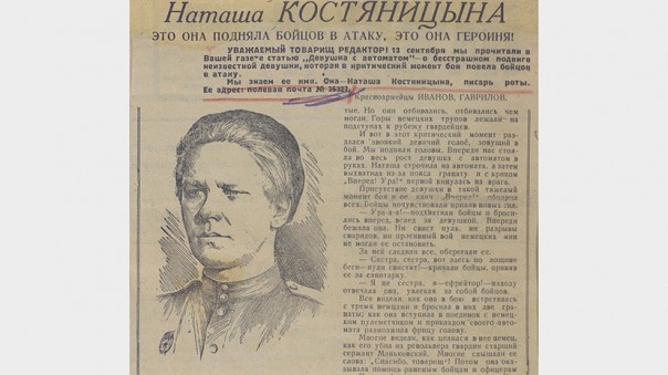 Фрагмент статьи из фронтовой газеты о Наталье Костяницыной / © female-heroes.mil.ru