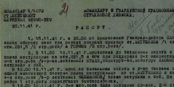 Фрагмент доклада Момыш-улы о бое 16 ноября 1941 года (фото: ЦА МО РФ)