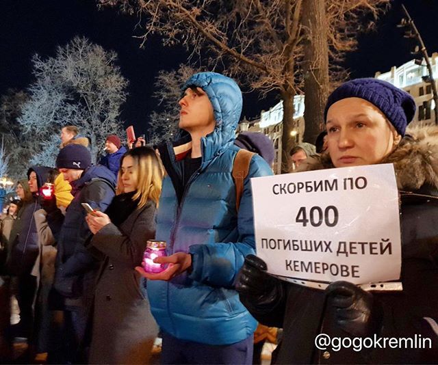 В 17-00 началась акция памяти на Манежной площади, организованная московскими властями. У входа в Александровский сад установлен баннер с надписью "Кемерово. 25.03.2018. Мы с тобой". Фотографии погибших, свечи. Волонтёры раздают мягкие игрушки и красные гвоздики.