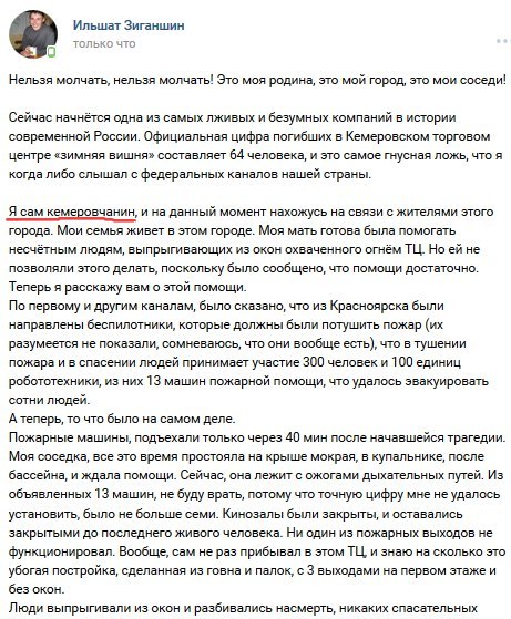 Провокаторы целенаправленно раскидывают по соцсетям дезу о "350-400 погибших". Фейковую информацию о "более 300 погибших" распространил, в частности, украинский телефонный пранкер Евгений Вольнов (Никита Кувиков). Подонок звонил в кемеровские морги, представлялся майором МЧС и советовал готовить места для сотен тел. Звонил он и родственникам, одноклассникам погибших, рассказывая о трёх сотнях тел. Представившись сотрудником администрации президента, пытался заставить чиновников "как можно скорее" убрать цветы и игрушки, оставленные скорбящими людьми в память о погибших детях. Всё это действо на своём YouTube-канале он назвал "Угораем с Кемерово". Вольнов глумился, издевался: пожар с многочисленными жертвами для толстого содомита (не имеет даже среднего образования, задерживался за покупку наркотиков, в 2016 году совместно с Алексеем Навальным, Станиславом Белковским и Дмитрием Дёмушкиным записал ролик в поддержку кандидата в депутаты Госдумы РФ от ПАРНАСа Вячеслава Мальцева, поддерживает тёплые отношения с главой навальненского штаба Леонидом Волковым и "Открытой Россией" Михаила Ходорковского, действует под крышей СБУ) - "дикий угар в «Зимней вишне»" и повод для циничного зубоскальства.