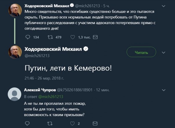 Президент встретился с инициативной группой, обвинившей власти в замалчивании, не доверяющей официальной информации о количестве жертв и требующей отставок. Глава государства дал слово, что расследование причин трагедии (находящееся под его личным контролем) будет максимально прозрачным, виновные обязательно понесут наказание. "Здесь следственная группа работает, 100 человек. Пройдут по всей цепочке, начиная с тех, кто давал разрешение, кончая теми, кто должен отслеживать безопасность, этим ЧОПом, сотрудник которого сидел там и кнопку не нажал вовремя, и так далее. Пройдут по всей цепочке, начиная с момента перерегистрации этого здания и выдачи разрешения из фабрики сделать развлекательный центр, кто давал разрешение на то, чтобы эти материалы использовать при таком целевом назначении. Это возмутительно, без сомнения. Эти 100 человек следователей отработают по полной программе, это точно, даже не сомневайтесь", - пообещал Путин. "Вопрос в чём, в том, что таких объектов по стране много. Вот сейчас МЧС зашевелилось, начали выяснять. Их там сотни", - отметил он. Члены инициативной группы потребовали полную информацию о погибших, поскольку "из-за отсутствия информации соцсети жути нагоняют". Один из активистов спросил президента: "Тулеев будет ещё сидеть у нас до сих пор?". "Произошла страшная трагедия, просто ужасная. Для того, чтобы принять решения подобного рода… Во-первых, под камеры это не делается – для красного словца на фоне трагедии. Первое. А второе: нужно точно совершенно определить, кто в чём виноват. И когда мы это сделаем, а мы это сделаем точно, будут приняты соответствующие решения" - ответил Путин. "Здесь статус ни при чём, когда люди погибли, столько мы детей потеряли. Мы говорим о демографии, призываем детей рожать, а в результате таких вот вещей столько детей потеряли", - добавил он.