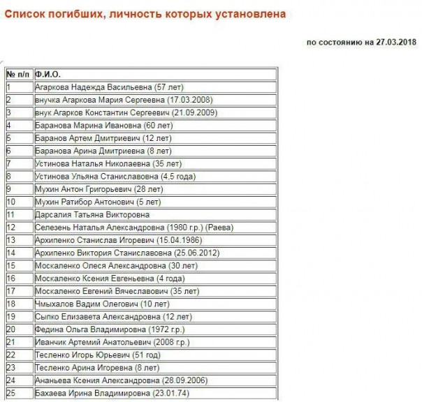 На сайте кемеровской городской администрации опубликован полный список погибших, пропавших без вести, госпитализированных в результате пожара в ТРЦ "Зимняя вишня". В списке пропавших без вести - 38 человек, в том числе 26 детей. Но вскоре после публикации сайт подвергся хакерской атаке и оказался недоступен.