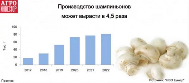 Кроме того, за прошлый год на 66% выросло производство культивируемых грибов. Это тоже результат строительства комплексов, о которых мы рассказывали. А в данный момент строится ещё 20 проектов, так, что в ближайшую пятилетку производство шампиньонов в стране может вырасти в 4,5 раза, сильно превысив внутреннее потребление.