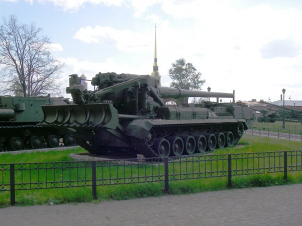 203-миллиметровая самоходная артиллерийская установка 2С7 "Пион" (вид сзади) в Артиллерийском музее Санкт-Петербурга