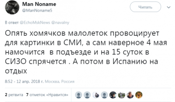 «В целом наблюдается значительное разочарование. Я вижу, что пишут его бывшие сторонники. Часть из них переметнулась к Гудкову, часть к Собчак перешла. Пишут: "Алексей, как же так? Вы обещали, что вас зарегистрируют, мы будем оказывать давление, а они так легко у нас выиграли выборы". Повестки у Навального никакой нет, на которую могли бы прийти люди. Нарушений на выборах тоже никаких не нашли.