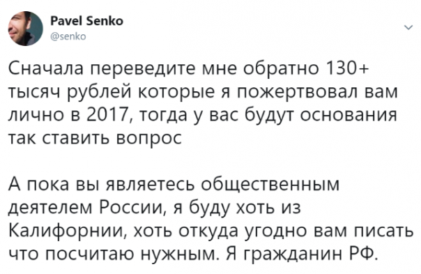 Какого же было его удивление, когда в ответ на справедливую критику Волков разразился в адрес навальниста гневным постом. Павла возмутило, что Волков дурно отзывался о погибшем и винил в несчастном случае власть. При этом даже не помог журналисту с трудоустройством в Москве в тот же ФБК, о чем просил его покойный. В ответ Сенко потребовал вернуть ему пожертвования, так как после общения с Волковым он разочаровался в движении Навального.