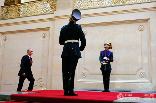 Церемония начнется незадолго до полудня с внесения знаменосцами Роты почетного караула государственного флага, Штандарта президента, Конституции и Знака президента. Под звуки "Встречного марша" они торжественно пронесут эти президентские символы по центральной дорожке сначала через Георгиевский, затем Александровский залы и установят на сцене в Андреевском зале. Специальный экземпляр основного закона страны размещают по правую руку на трибуне, где будет принята присяга, а знак — по левую. Туда же поднимаются председатель Конституционного суда и спикеры Совета Федерации и Госдумы.