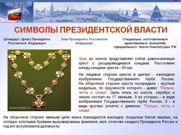 Символами президентской власти являются штандарт, знак и специальный экземпляр текста Конституции, на котором приносится присяга. Они передаются вновь избранному президенту России во время процедуры вступления в должность.