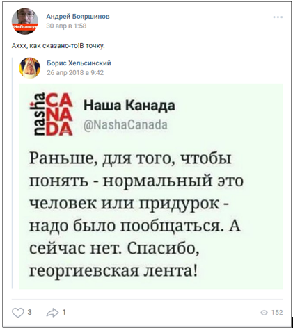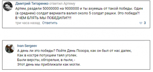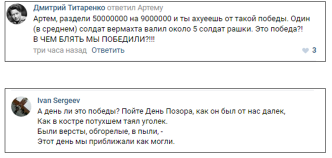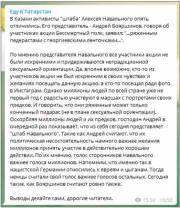 Ну а оскорблять миллионы людей, которые уже не первый год принимают участие в маршах с фотографиями своих предков, познавших ужасы войны, может только моральный урод. Бояршинов – это лицо всего штаба Навального, сторонники которого привыкли только гадить. В День Победы навальнисты глумились не только над участниками «Бессмертного полка», акцией «Георгиевская лента», но и над ветеранами. Вот такие непотребства они писали в соцсетях: